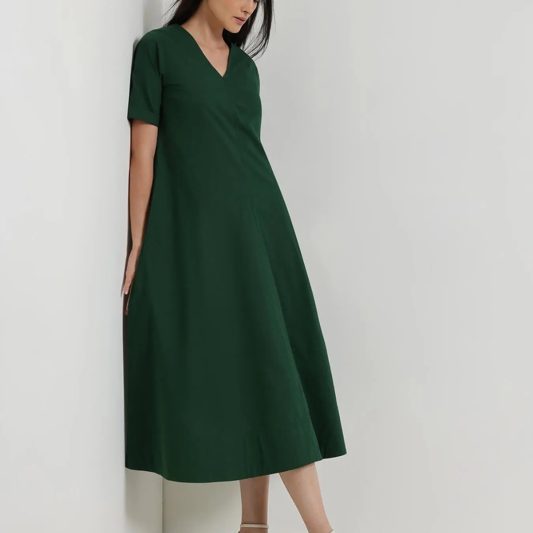 Refreshing green cotton fit & flare midi dress for graceful movement. Ideal for elegant daytime looks.