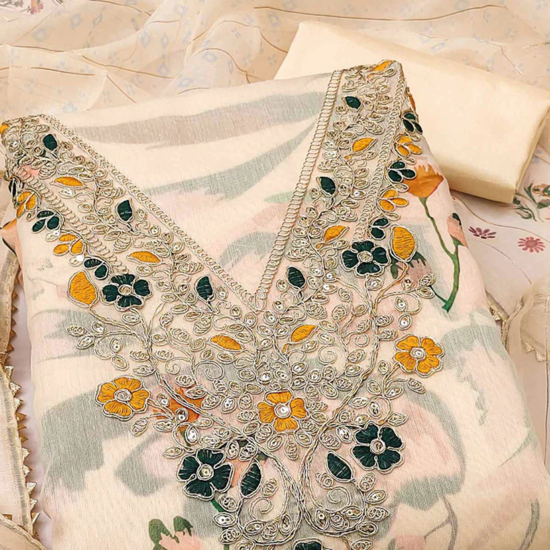 Cream Chanderi Silk Dress Material with Digital Floral Print & Cording Embroidery