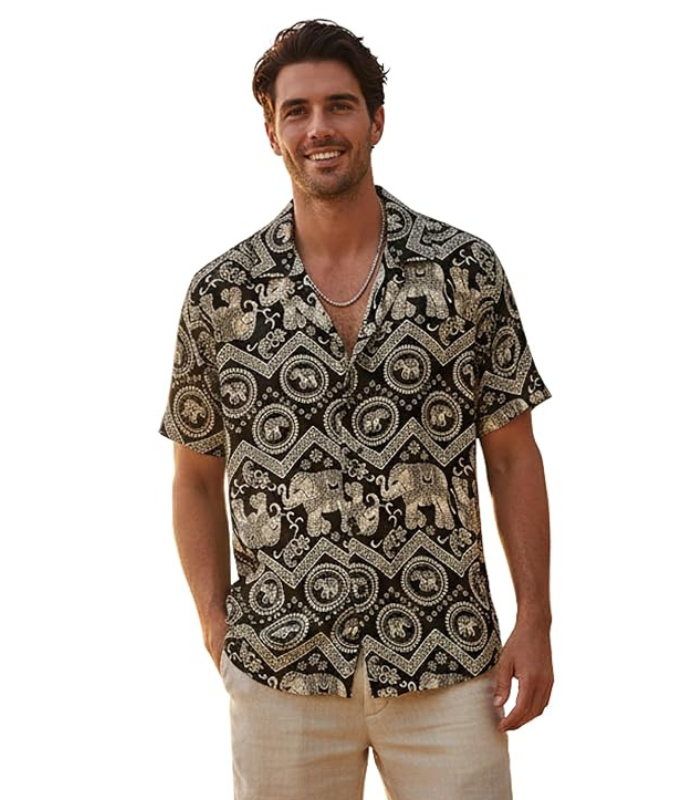 • Glowic Men’s Premium Cotton Blend Printed Cuban Collar Shirt | Stylish Elephant Motif Half Sleeve Beach Wear Casual Button Down Hawaiian Shirt for Men