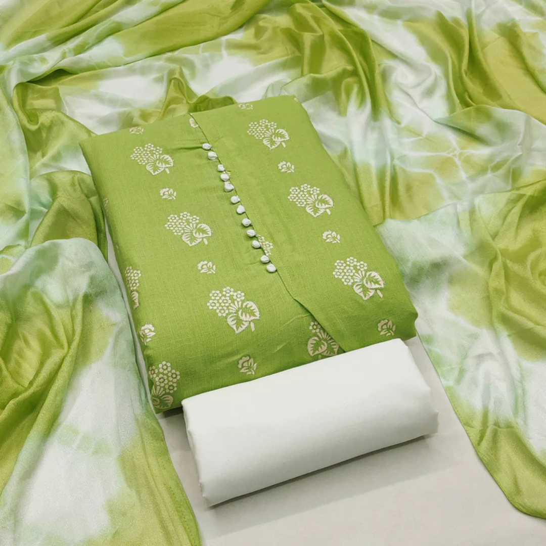 Refreshing green cotton blend dress material with elegant floral prints. Comfortable and stylish for daily elegance.