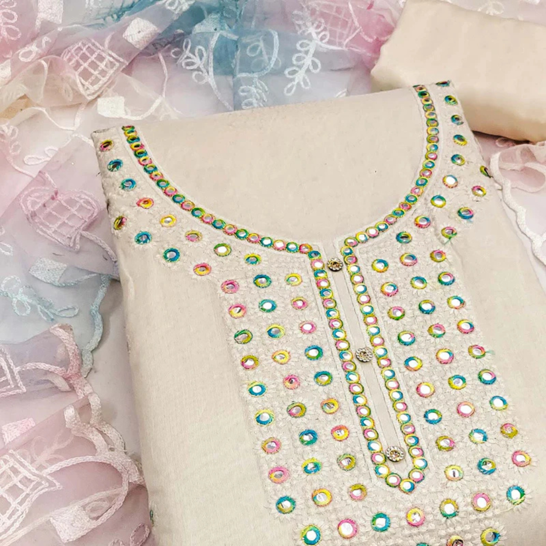 Off White Designer Chanderi Dress Material with Intricate Thread Embroidery Detailing