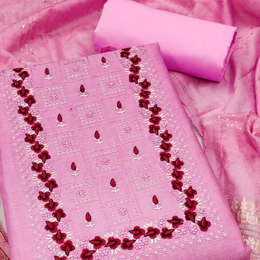 This pink floral embroidery cotton blend dress material combines comfort with sparkle. Crafted from breathable cotton blend for easy wear. Floral threadwork adds delicate detailing. Sequins embellishments provide subtle shine. The soft pink shade enhances romantic charm. Ideal for festive occasions and family events. A beautiful choice for elegant ethnic attire.