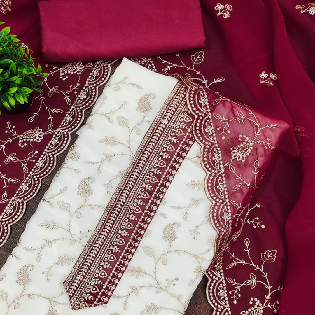 This white and pink georgette dress material offers delicate elegance. The soft georgette fabric provides fluid draping and comfort. Floral thread embroidery adds refined detailing. The gentle color combination enhances its feminine appeal. Ideal for festive wear and semi-formal occasions. Its lightweight structure allows versatile tailoring. A sophisticated option for modern ethnic outfits.