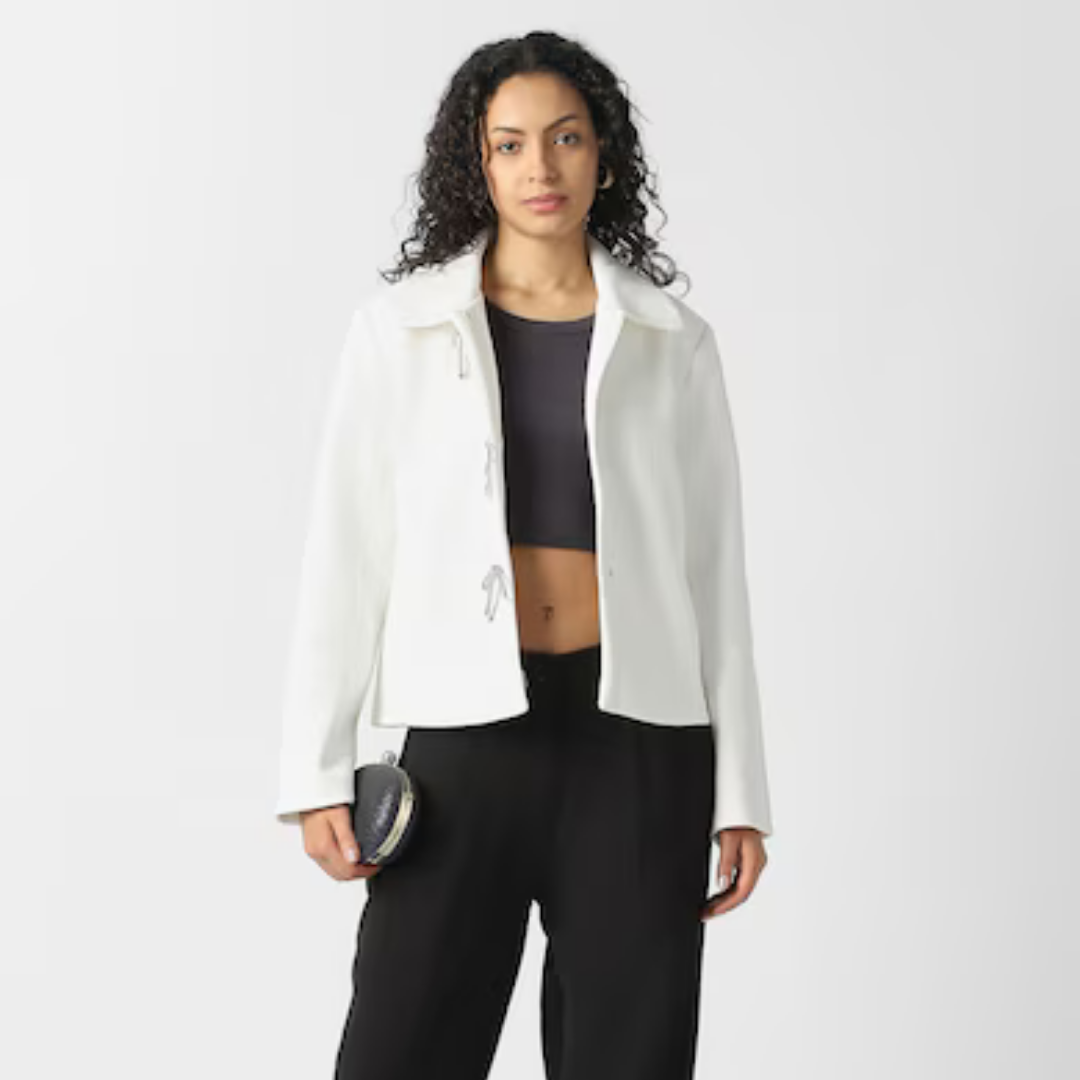 Sophisticated white textured jacket ideal for modern casual outfits.