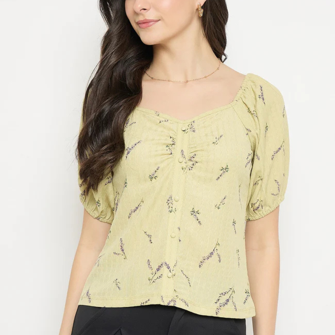 Bright yellow ruched puff sleeve top for a playful and feminine style. Designed for comfort and trend.